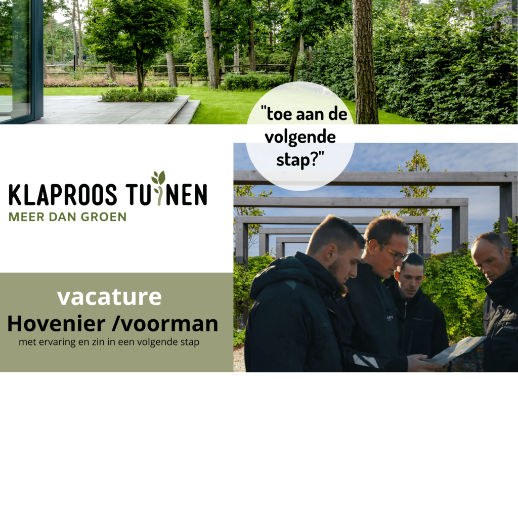 Ben jij een ervaren hovenier of voorman die toe is aan een volgende stap? Wil je werken in een professioneel, maar vooral ook gezellig en betrokken team? Bij Klaproos Tuinen krijg je de ruimte om jouw vakmanschap te laten zien én kun je actief meebouwen aan de groei en ontwikkeling van ons bedrijf. Niet alles is bij ons al in beton gegoten: er is volop ruimte voor eigen inbreng en initiatief. Een ideale kans voor iemand die niet alleen wil doorgroeien, maar ook wil meedenken en bouwen aan de toekomst van ons bedrijf.